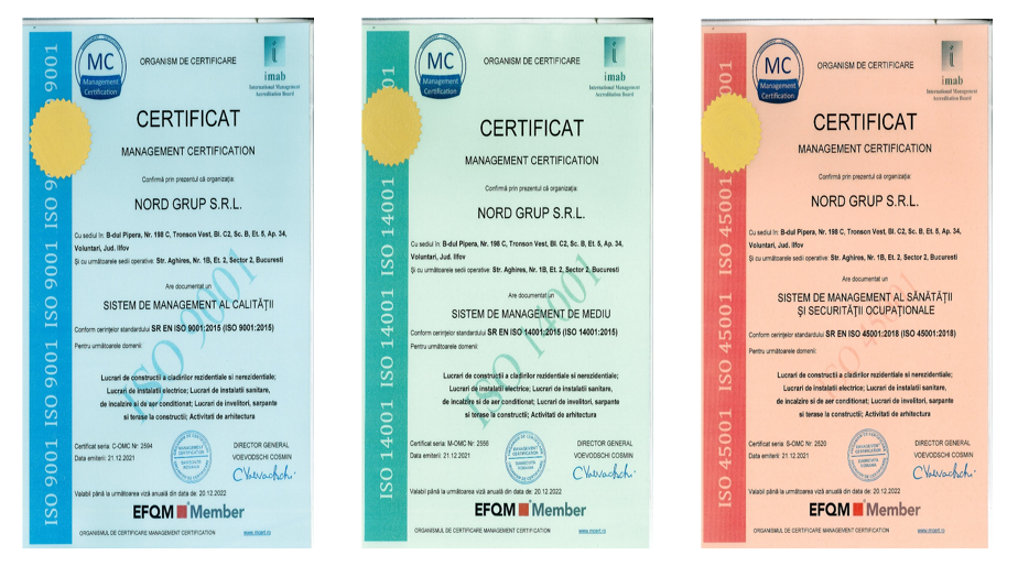 Suntem certificați ISO 9001 pentru managementul calității, ISO 14001 pentru managementul de mediu, și ISO 45001 pentru sănătate și securitate operațională, reflectând angajamentul nostru față de excelență și responsabilitate.